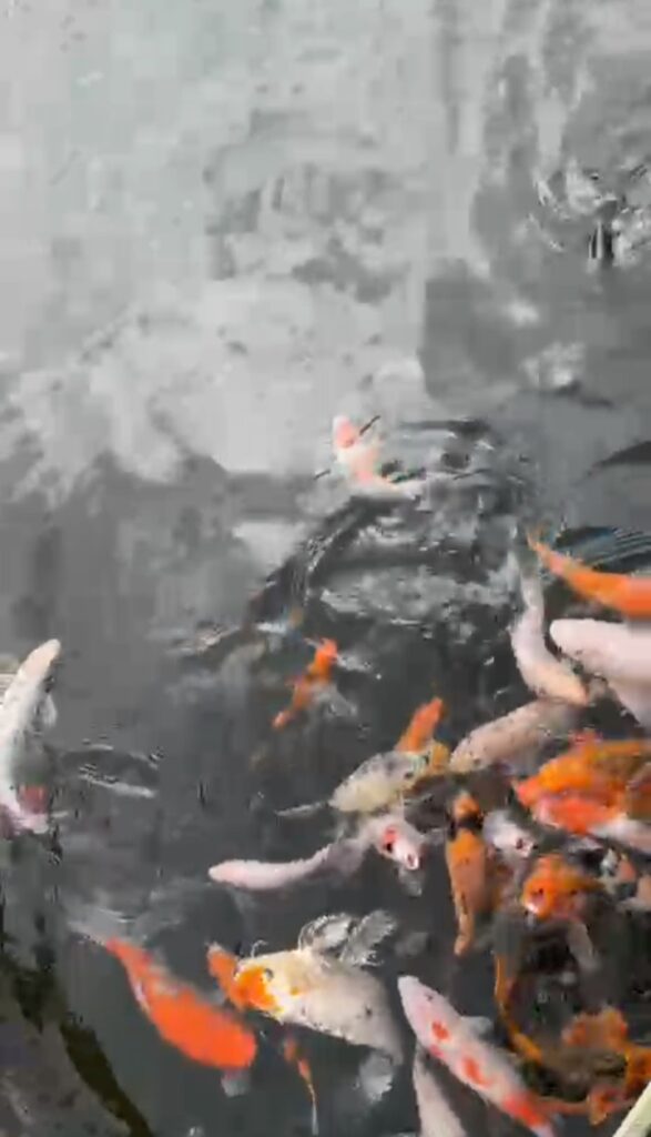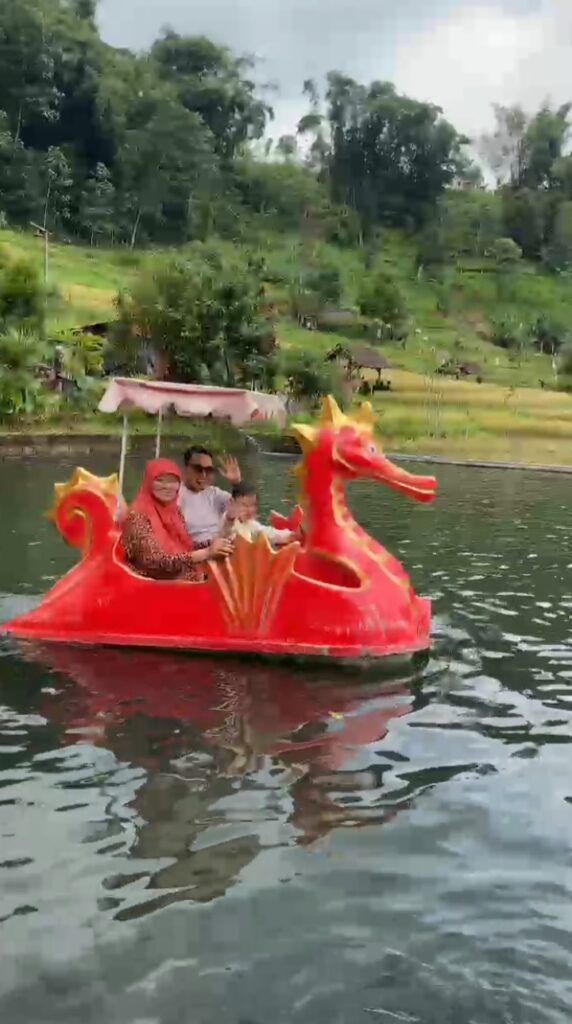 Setelah berjalan sepanjang bedengan sawah, kami menyempatkan diri untuk naik kereta sawah, mencoba sepeda air, juga memberi makan ikan koi yang besar-besar dan jinak. Aih, ikan koi yang melenggok ke sana ke mari seolah memberikan salam pada kedatangan kami.