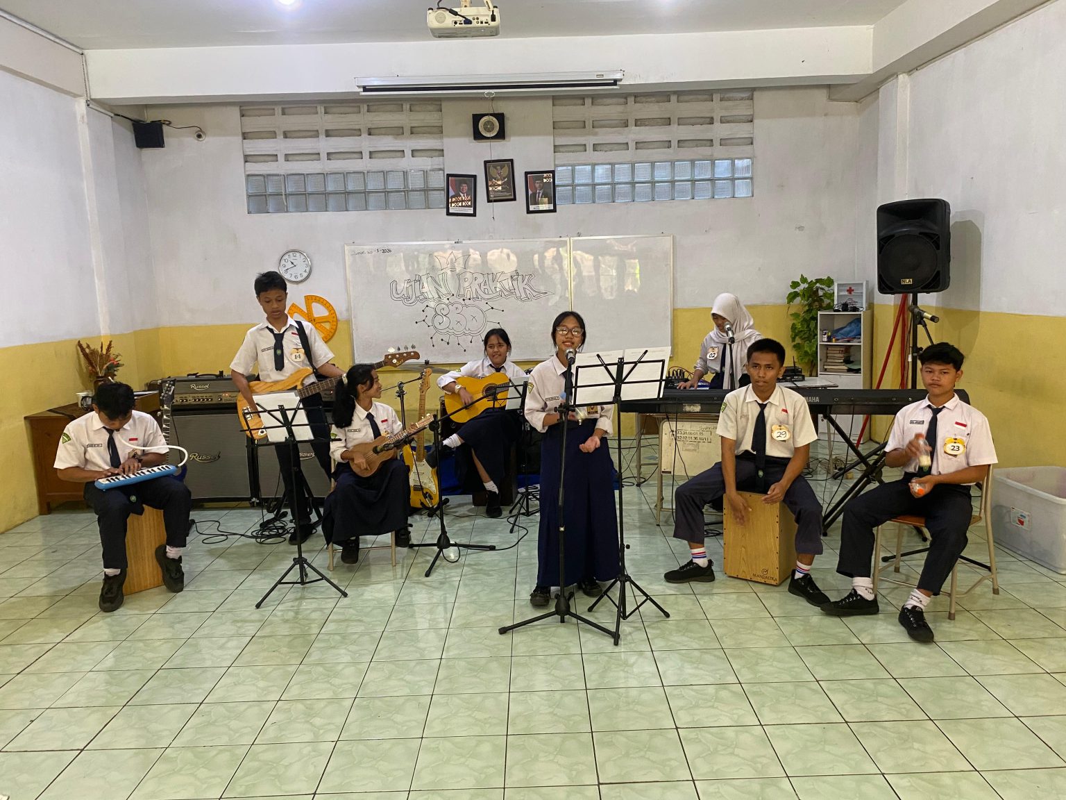 Kemeriahan ujian praktik sangat terasa ketika kita memasuki area ujian seni dan bahasa. Ya, di sana para siswa bersama kelompok band mereka membawakan lagu-lagu bergenre pop, jazz, rock, hingga dangdut dalam bahasa Indonesia dan Inggris.