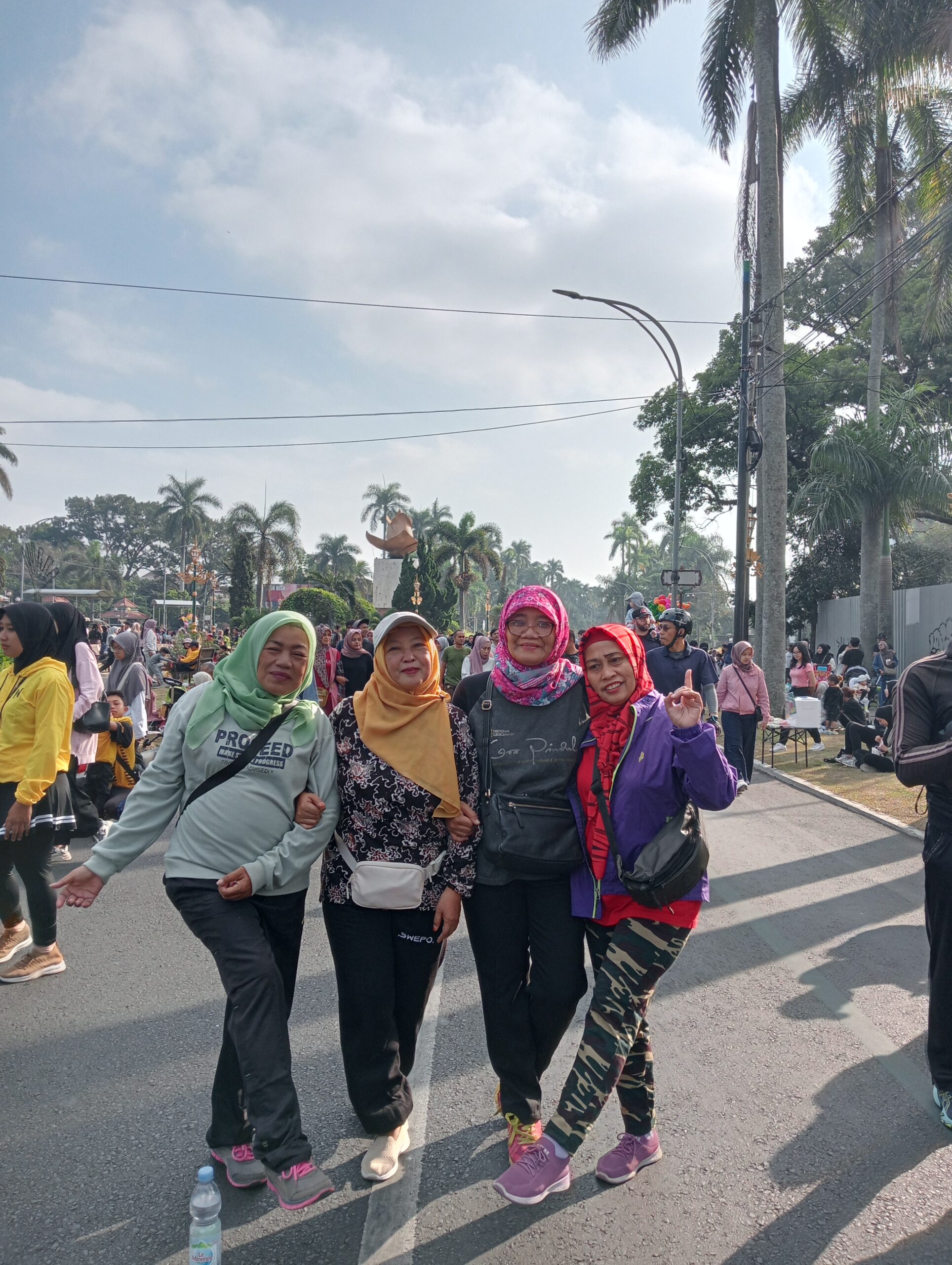 “Iya, jalan-jalan saja,” kata yang lain. Semua sudah ngos-ngosan mengikuti senam aerobik yang baru saja dimulai.