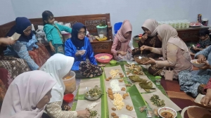 Berbagai hidangan hasil olahan para ibu disajikan didaun pisang yang memanjang di tengah ruangan. Ada nasi putih, nasi jagung, urap sayur, ayam kecap, bakwan jagung, mendol, rempah dan banyak lagi.
