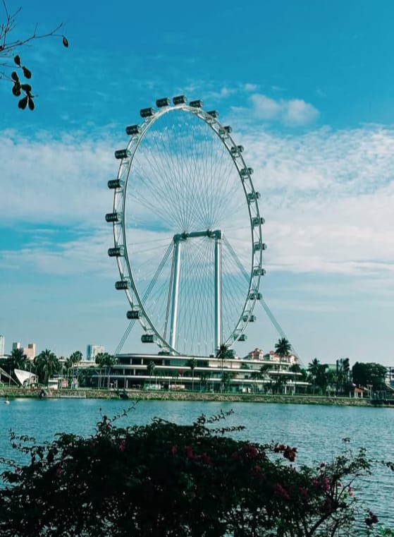Dari kejauhan tampak Singapore Flyer berdiri perkasa. Singapore Flyer adalah sebuah bianglala raksasa setinggi 165 meter yang dengan wahana ini kita bisa melihat pemandangan 360 derajat kota Singapura, termasuk sebagian Malaysia dan Indonesia saat cuaca cerah.