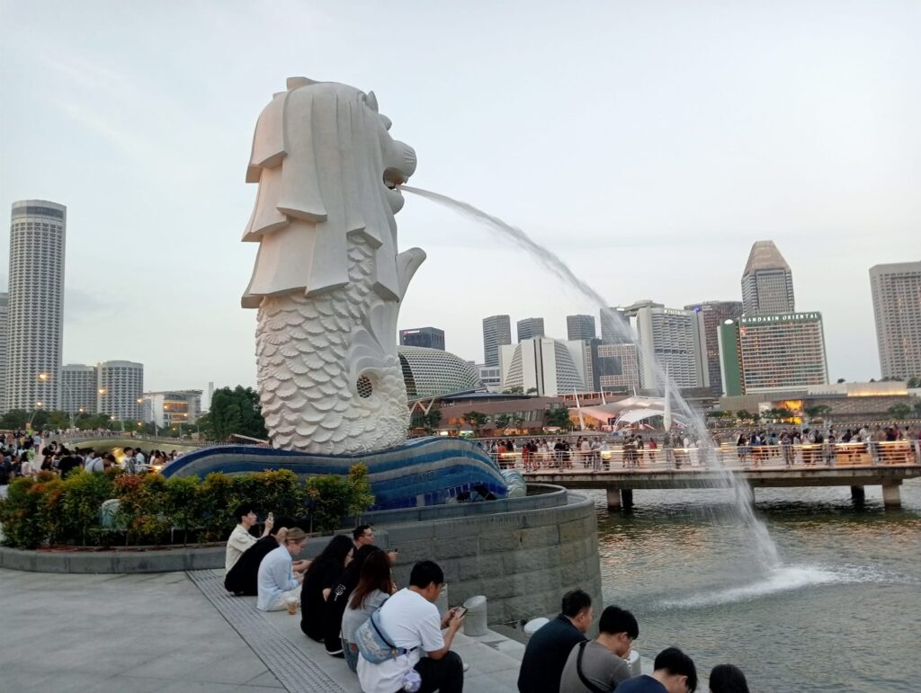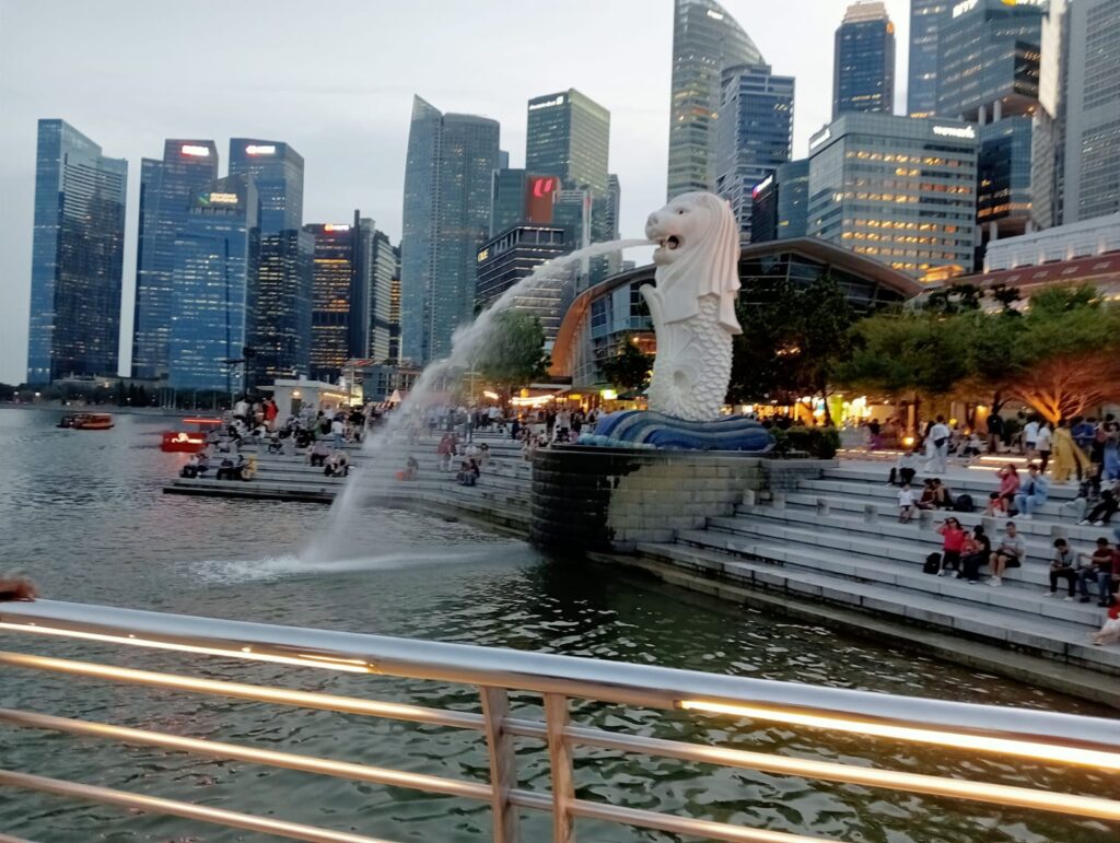 Di antara berbagai bangunan yang ada, tampak Merlion berdiri tegak menjadi ‘penjaga’ dan menyemburkan air dari mulutnya dengan tenang. Merlion seolah saksi perpaduan antara mitos dan modernitas yang ada di Marina Bay.