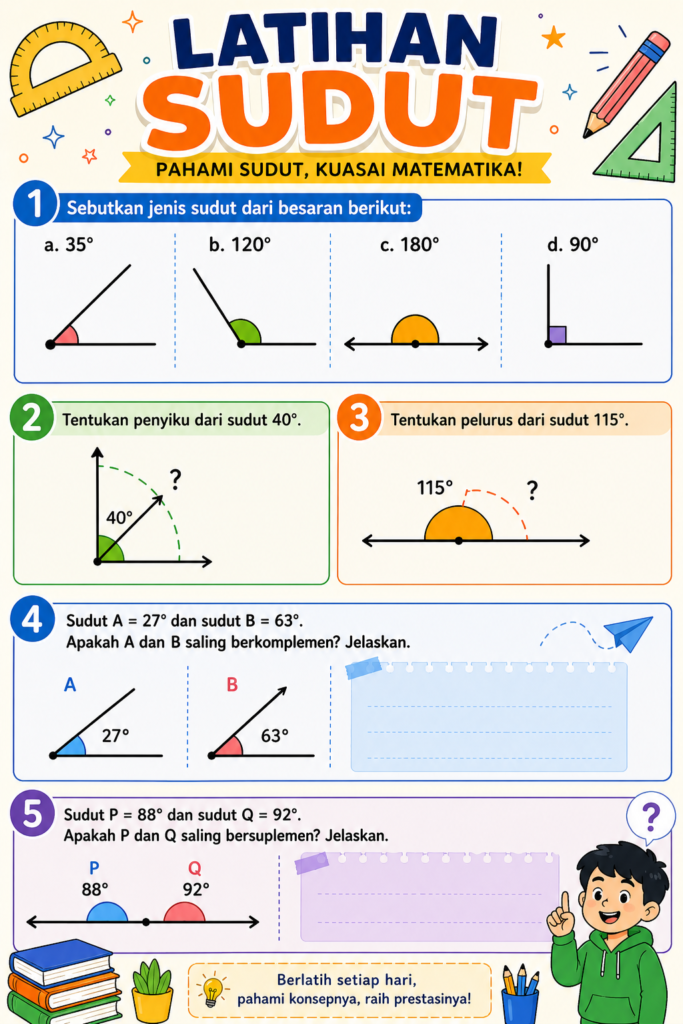 · Sudut 30° + Sudut 60° = 90° → 30° dan 60° saling berkomplemen.