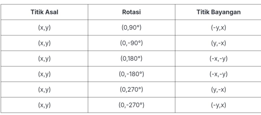 Secara umum, rotasi suatu titik dibagi menjadi dua, yakni rotasi terhadap titik pusat (0,0) dan rotasi terhadap titik (a,b). Namun, pada tingkatan ini, kita hanya akan membahas rotasi terhadap titik pusat (0,0) dulu, ya. Jika kalian sudah berada di bangku SMA, baru akan belajar materi yang lebih lanjut.