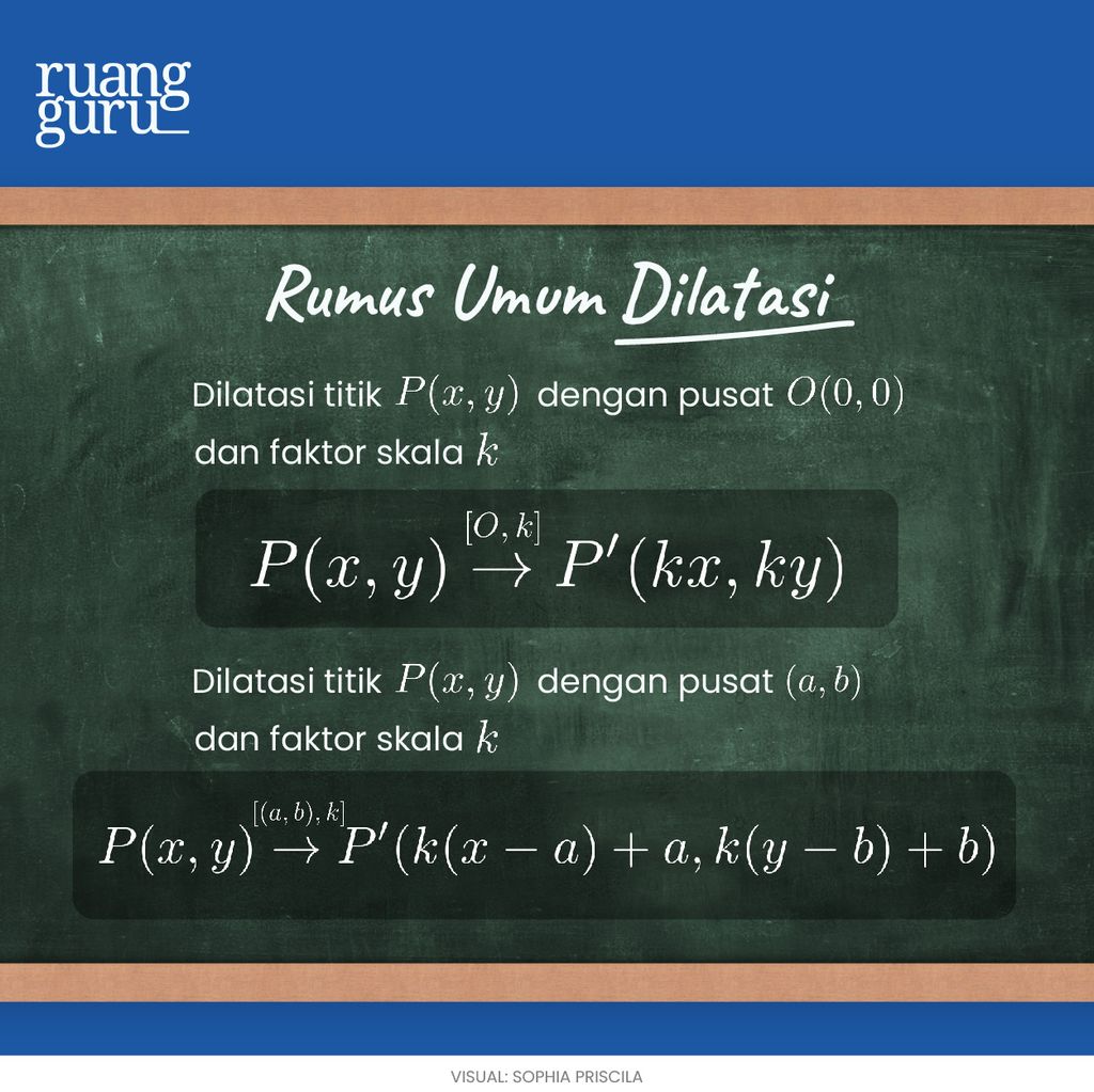Dilatasi adalah suatu transformasi yang mengubah ukuran suatu objek atau benda, bisa memperbesar atau memperkecil. benda dengan pusat dan skala tertentu.